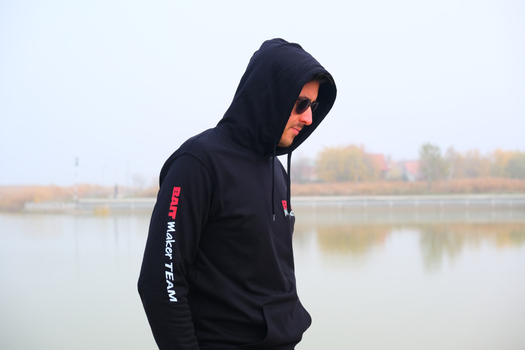 80% pamut 20% poliészter, elől-hátul és a karján Bait Maker Team felirattal ellátott fekete kapucnis pulóver.