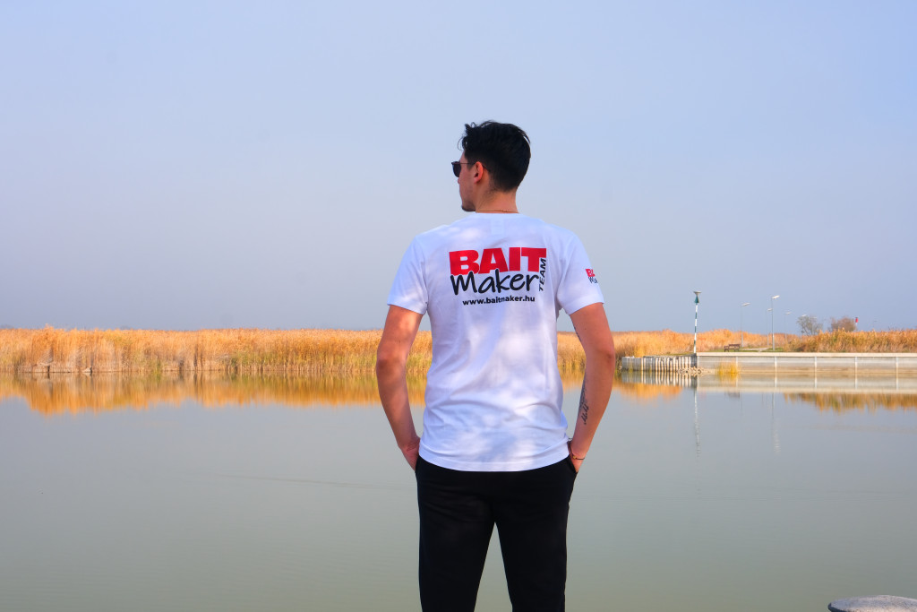 100% Pamut, elől-hátúl Bait Maker Team felirattal ellátott fehér rövid ujjú póló.