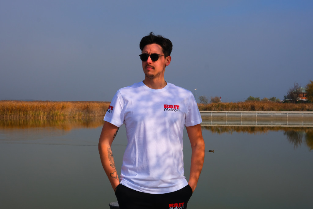 100% Pamut, elől-hátúl Bait Maker Team felirattal ellátott fehér rövid ujjú póló.