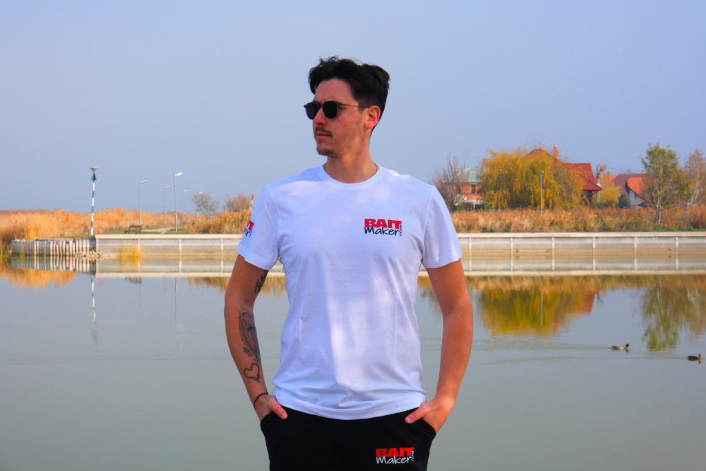 100% Pamut, elől-hátúl Bait Maker Team felirattal ellátott fehér rövid ujjú póló.
