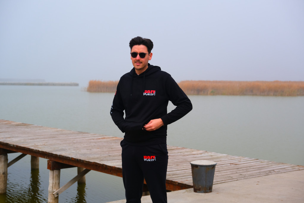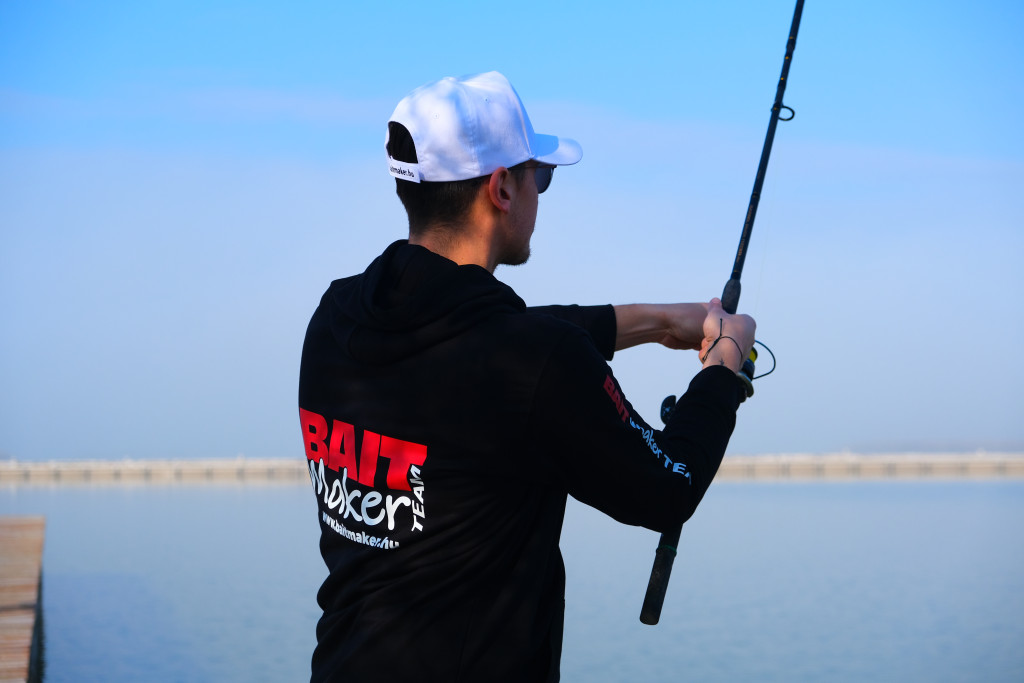 80% pamut 20% poliészter, elől-hátul és a karján Bait Maker Team felirattal ellátott fekete kapucnis pulóver.